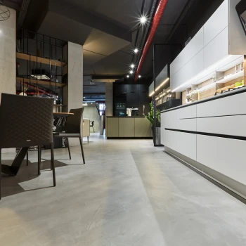 Полы из микроцемента идеально подходят для зон с высокой проходимостью, устойчивы к пятнам и легко моются, что критически важно для заведений общественного питания.