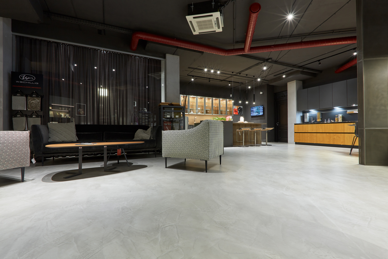 Микроцементные полы и стены создают спокойную, деловую и одновременно современную атмосферу, способствующую продуктивной работе.