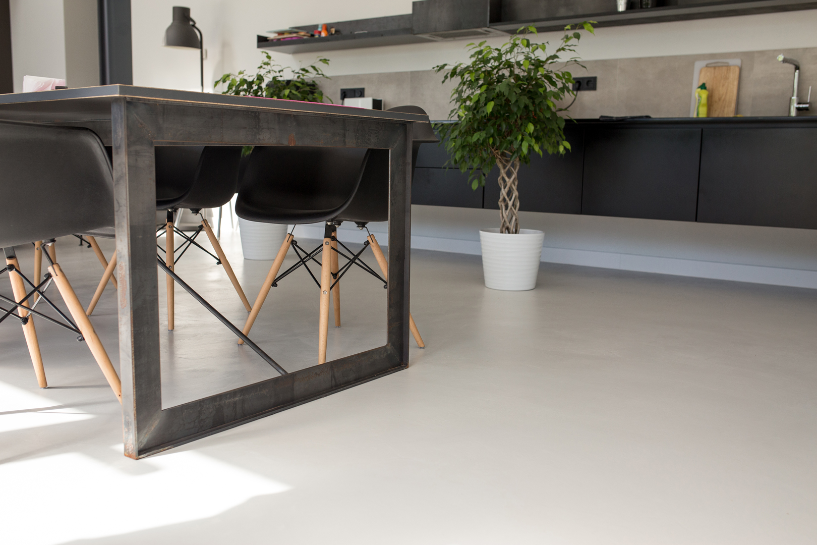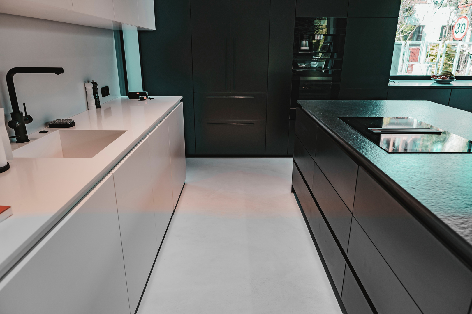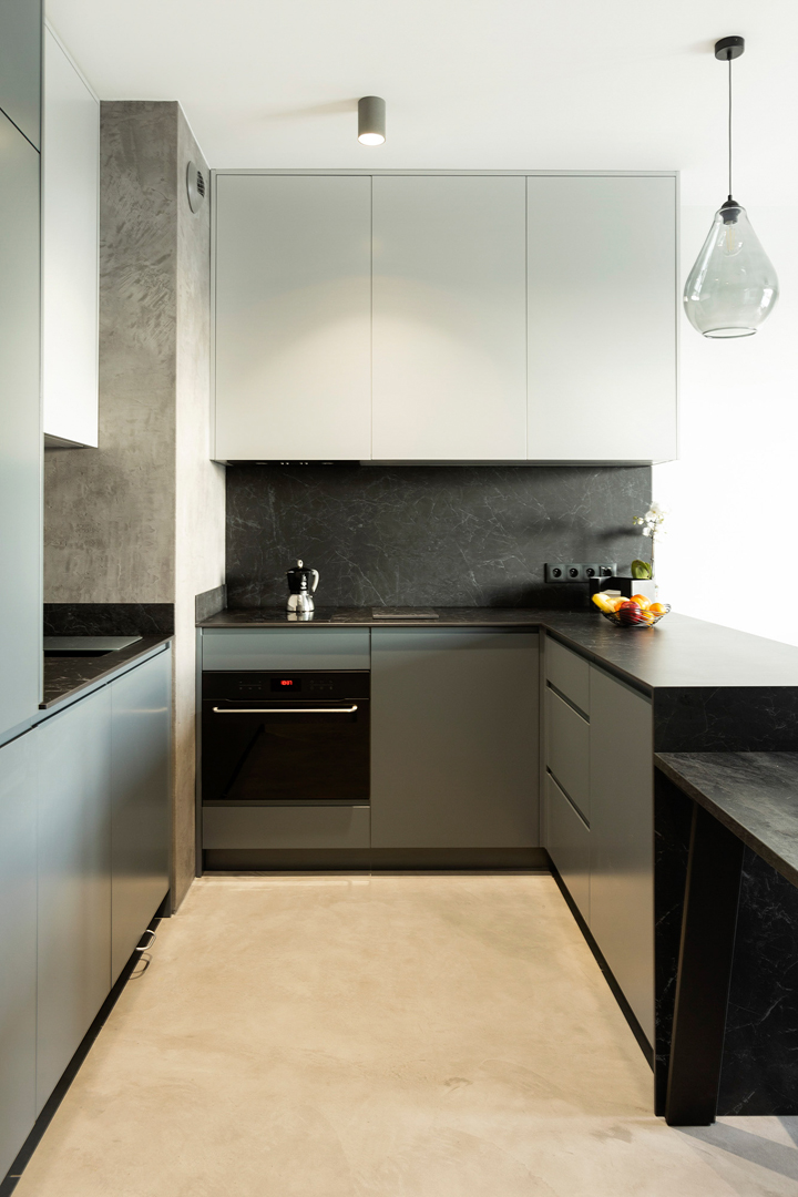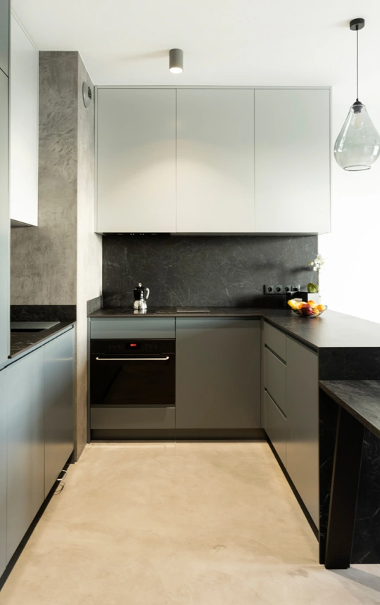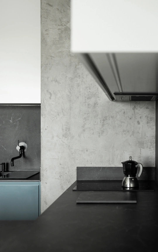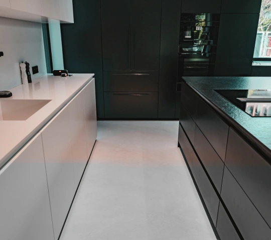 Микроцемент, особенно с качественным финишным защитным покрытием (полиуретановый лак ), достаточно устойчив к жиру и брызгам от готовки. Его гладкая и непористая поверхность затрудняет впитывание жира, что облегчает уборку. Однако, для поддержания идеального состояния рекомендуется своевременно протирать поверхность влажной губкой и использовать щадящие моющие средства.