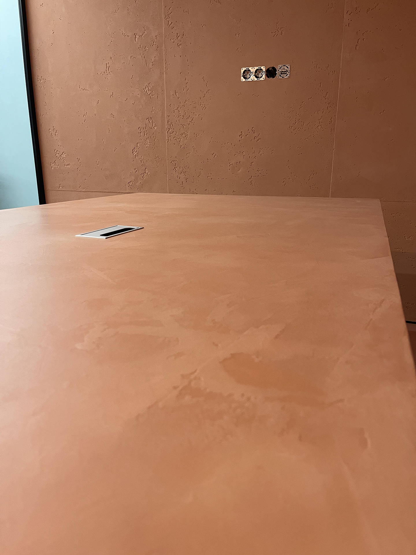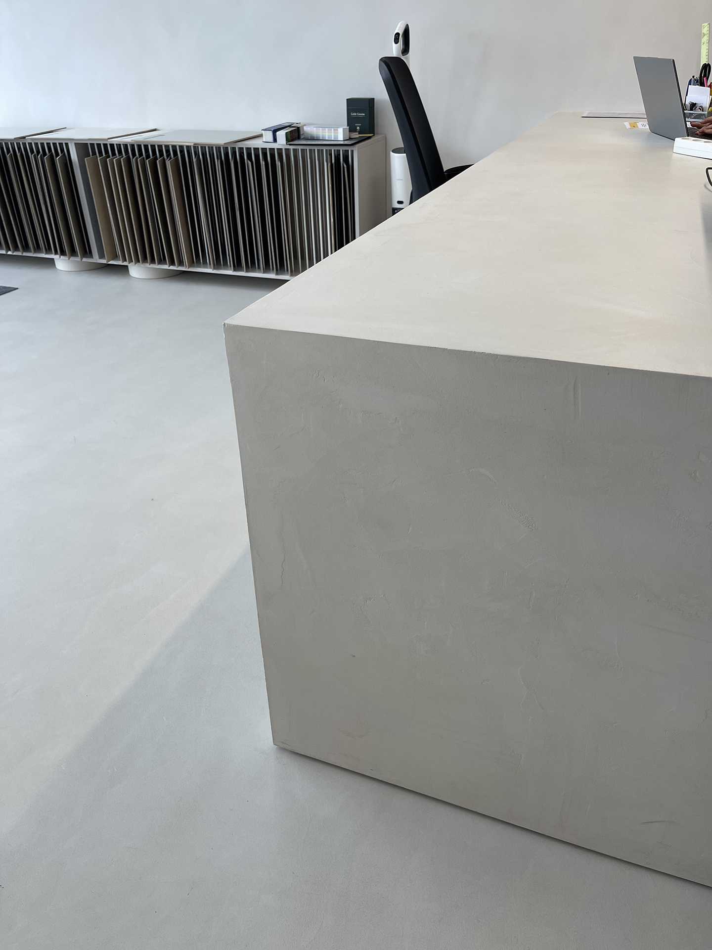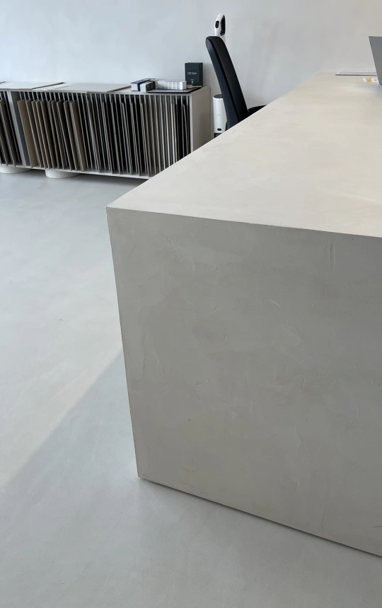 В нашем шоуруме весь интерьер выполнен с использованием микроцемента, а также в наличии множество образцов разных цветов и фактур